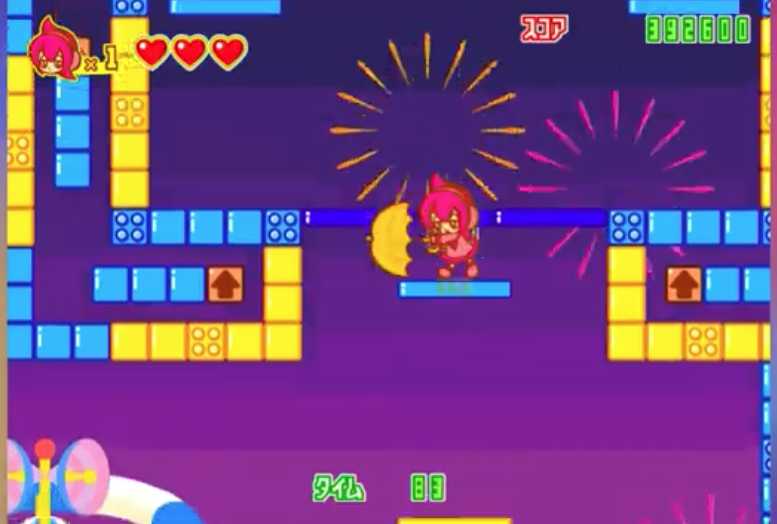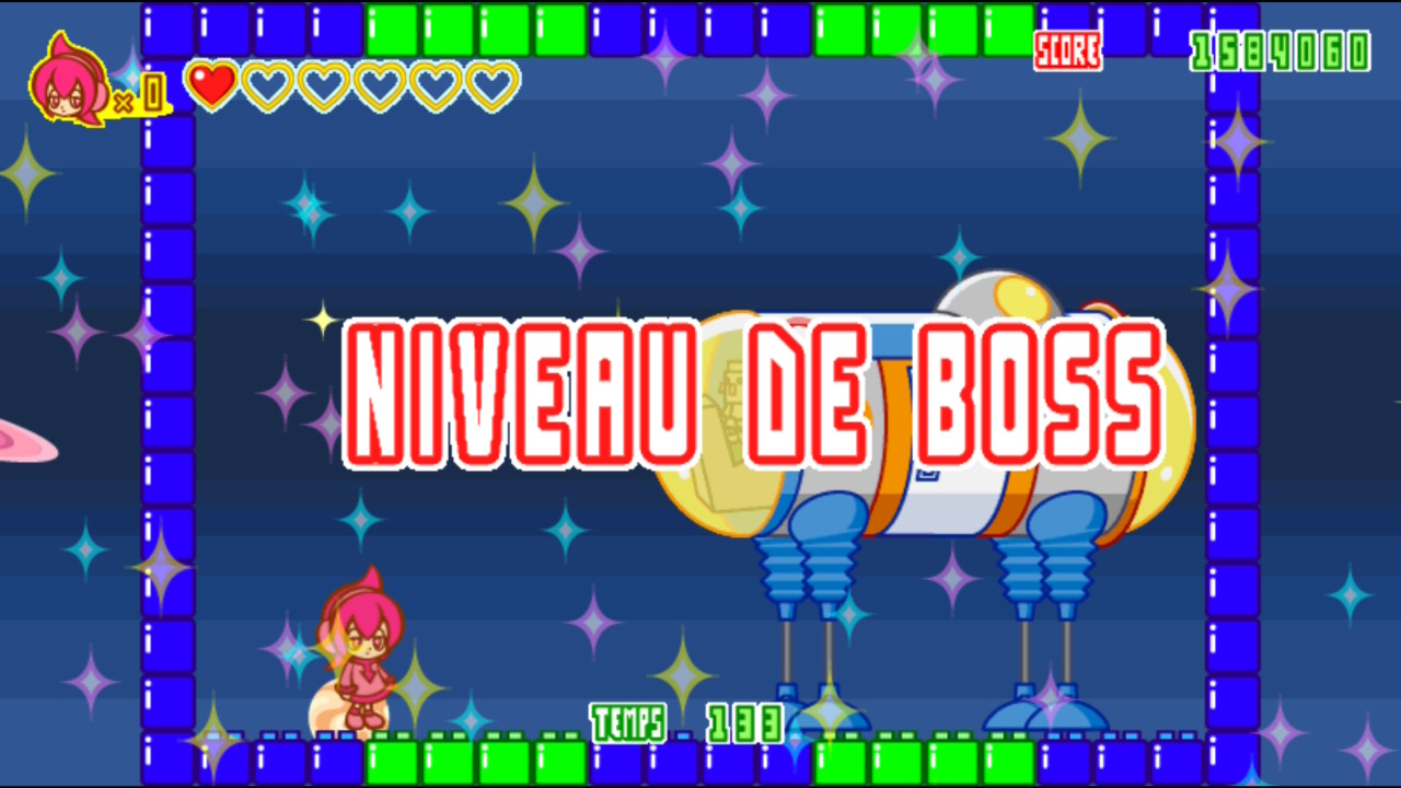 Spica Adventure Alias Supika Adobenchā est donc un titre sorti en 2003 sur mobiles et en Arcade, mais uniquement au Japon. Cette nouvelle édition est donc la première apparition officielle du titre chez nous. Reprenant l’idée de l’utilisation d’un parasol multi usage, Spica Adventure s’inspire donc bien évidemment de son ancêtre Parasol Stars, mais il est loin d’en être une copie conforme. Pour commencer il n’a aucun lien scénaristique avec Bubble Bobble, et n’aura pour seule référence aux autres jeux de l’éditeur qu’un boss inspiré de Space Invaders. Spica Adventure vous met donc aux commandes d’une jeune spationaute du nom de Nico qui se balade dans l’espace lorsque soudain, un prospectus lui bouche la vue et la force à s’écraser sur une planète inconnue. Mécontente de son accident, elle va se défouler sur les habitants de la planète. Le pitch est stupide et concrétisé à l’écran par une cinématique d’intro de belle facture. Le jeu embraye ensuite sur un choix de la langue dont le français. Certes il y a peu à lire mais ça fait toujours plaisir. Le menu principal propose ensuite trois modes de jeux, un défilé d’options et une section bonus permettant de revoir certaines cinématiques et de voir des galeries d’images - sous condition de les avoir débloquées auparavant. Les options permettent de régler la balance sonore et d’effectuer des réglages de commandes en modifiant les boutons et en activant ou non certaines améliorations de confort. Niveau modes de jeu, le mode original permets de jouer au jeu tel qu’il était en Arcade, avec des crédits illimités. Le mode normal propose des améliorations et des objets à collectionner (pour débloquer des artworks). Enfin, le mode défi permet de faire du scoring sur différents niveaux de difficulté