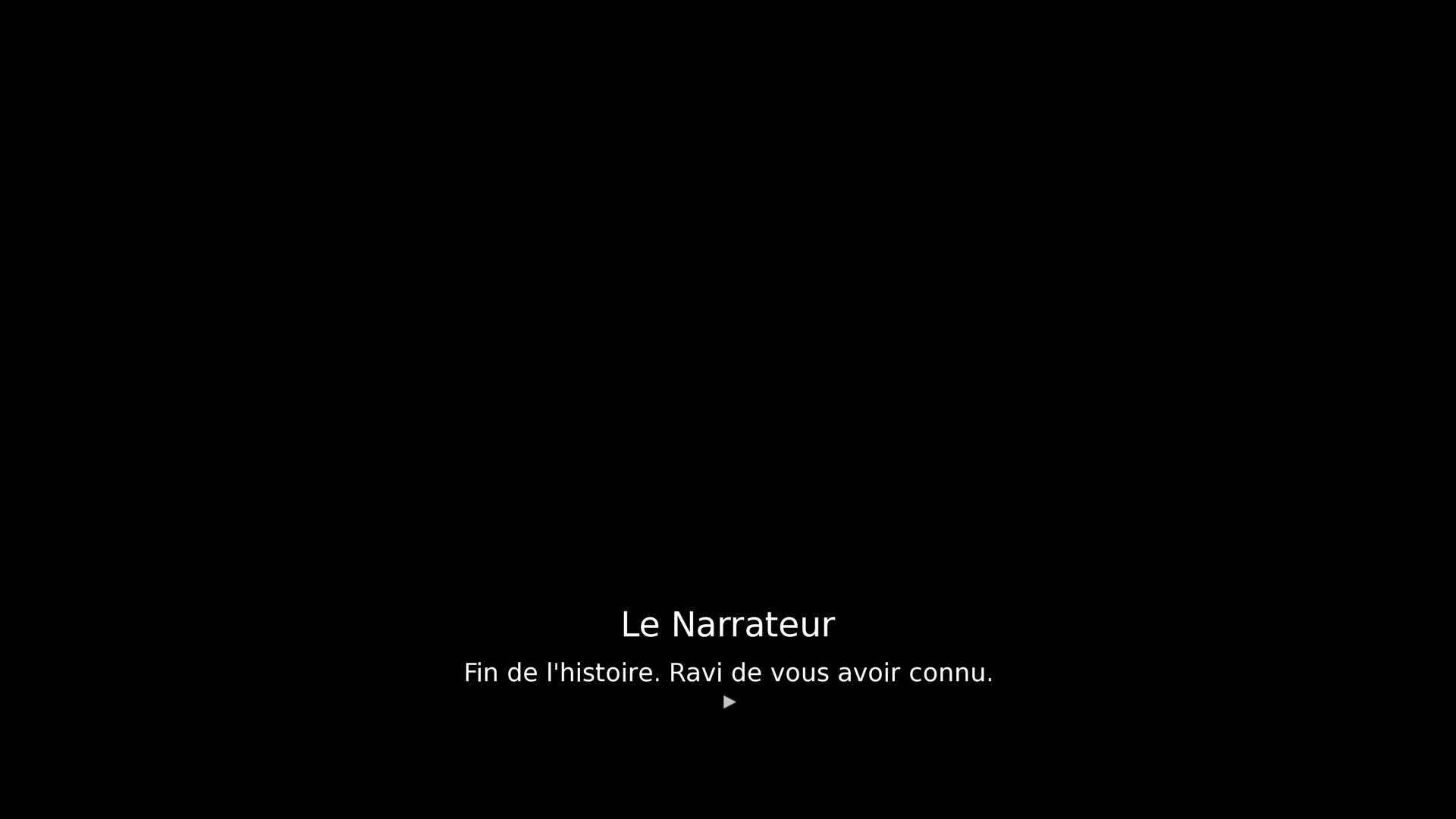 Mais tout doit avoir une fin, et votre histoire finira assez vite, après environ 30 minutes. Une conclusion arrivera, qui vous encouragera clairement à recommencer un cycle. C’est d’ailleurs tellement nécessaire pour réellement profiter de l’expérience que le jeu ne vous demande même pas votre avis et relance le début de l’histoire sans transition. Et si votre nouveau cycle ne fait pas référence au précédent, vous comprendrez assez vite que les cycles sont quand même liés entre eux, même si les liens sont plus subtiles que dans ces cycles en eux mêmes. Je n’en dirai pas plus, car je ne vois pas comment donner plus de détails sans gâcher votre expérience. Par contre au cas où ce ne serait pas clair : si vous aimez une écriture vidéoludique ciselée aux petits oignons, jetez vous sur le titre. On alterne entre le rire, le glauque, le touchant et l’effrayant avec un rythme et un dosage parfait. Vous ne le regretterez pas.