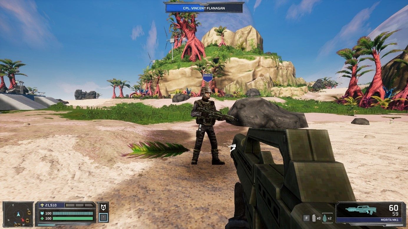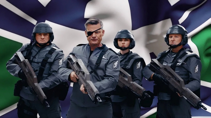 Si l'histoire de base de Starship Troopers ultimate Bug War! retrace globalement les évènements du film (tout en intégrant des éléments du livre comme les exosquelettes), il sait aussi s'en détacher pour mieux surprendre. Ainsi, en tant que joueur, vous ne jouez pas directement les aventures de Rico et de sa bande. A la place, vous êtes invités à jouer à un jeu vidéo de propagande pour devenir citoyen. Quoi de mieux pour embrigader les jeunes dès leur plus tendre jeunesse. Prouvez que vous pouvez le faire en virtuel et vous pourrez le faire en vrai en devenant citoyen. Le jeu apporte d'ailleurs beaucoup de scènes en full motion video reprenant le principe des scénettes qui égrenaient le film avec leur slogan "voulez-vous en savoir plus ?". Pour enfoncer le clou du fan service, les développeurs du jeu se sont assurés de la coopération de Casper Van Dien, acteur principal du premier film, qui joue ici le même rôle, mais des années plus tard en tant que Major. Le jeu vidéo développé intradiégétiquement par la FedDev retrace les faits d'arme d'une femme du nom de Samantha Dietz, qui a survécu à cette guerre. Vous allez donc devoir jouer son rôle et réussir comme elle a pu le faire à stopper la menace arachnide. Le jeu n'est malheureusement pas doublé en français, mais les textes et les doublages le sont. Attention toutefois, c'est souvent écrit très petit, et en mode portable c'est souvent un problème (surtout pour lire les objectifs). Avant de lancer le jeu, n'hésitez pas à faire un tour dans les options qui sont très nombreuses et réglez dès que possible la sensibilité du stick, car de base c'est trop rapide et injouable. Ou sinon, pensez à activer le mode souris. Si vous avez une table ou un support adapté c'est vraiment plus agréable pour la visée. Il faudra un temps d'adaptation pour trouver la bonne prise en main, mais ça finit par arriver après quelques minutes. N'essayez pas sur le genou par contre ça ne fonctionne pas très bien. En lançant le jeu, vous serez peut-être surpris par un style graphique mélange de low poly, de pixel art et d'effets pyrotechniques plus modernes. C'est un peu fourre-tout, mais ça fonctionne assez bien en restant sur une approche faussement série Z du film. Niveau musique, on est sûr de l'excellent travail avec des thèmes épiques et martiaux.