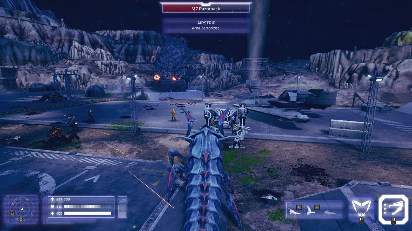 A mesure que vous avancez dans la campagne principale, des missions d'une autre campagne se débloque. Le campagne bug permet donc d'incarner "l'assassin", une espèce de général arachnide ayant la capacité de muer pour se transformer selon les besoins. Cette campagne ne dispose que de 5 missions relativement faciles et beaucoup plus courtes (comptez 15-20 minutes contre 45 minutes pour les missions classiques). L'originalité est donc d'inverser les rôles et d'incarner l'ennemis pour semer le chaos dans les rangs humains. Là encore plusieurs objectifs sont disponibles et c'est à vous de les réaliser dans l'ordre qu'il vous sied. Tous les objectifs sont ici identiques : terroriser un camp humain en massacrant et détruisant tout ce que vous pouvez avant de terminer par le centre de commandement. Pour vous épauler, il faudra trouver sur la carte des nids arachnides qui serviront à faire apparaitre des larbins (vous pouvez indiquer une zone pour qu'ils l'attaquent), mais aussi à vous soigner tant que vous restez à portée. Il n'y a jamais de temps limité dans les missions, donc en cas de coup dur, n'hésitez pas à aller faire une petite cure dans un nid avant de revenir en pleine forme. Si vraiment c'est trop compliqué, muez-vous en forme de destructeur cracheur de flammes, ce qui aura pour effet de vous rendre toute la vie et l'armure. La plupart du temps votre forme de base vous permet de foncer rapidement et d'attaquer avec vos mandibules. La forme de criquet par contre permet de sauter très haut dans le ciel, d'atteindre des points très en hauteur et de foncer en piquée sur des troupes au sol. Cette campagne ne restera pas dans les annales mais est un bonus sympa pour diversifier un peu l'action. Une fois les campagnes terminées le jeu vous propose quelques carottes pour y retourner. Outre un système de scoring sur chaque mission et des niveaux de difficulté supérieurs pour les masochistes, chaque carte contient 2 secrets généralement bien planqués à trouver (je n'en ai trouvé qu'un seul lors de ma première campagne). Les secrets déverrouillent des mods de jeu activables ensuite lors de futures missions. Certains sont cosmétiques (plus de sang...), d'autres rigolos (mode sans gravité...) et d'autres changent les conditions de jeu soit pour renforcer la difficulté (mort en un coup...), soit pour vous aider (pouvoir tirer sans recharger...). C'est une excellente idée qu'on aimerait voir plus souvent dans les jeux.