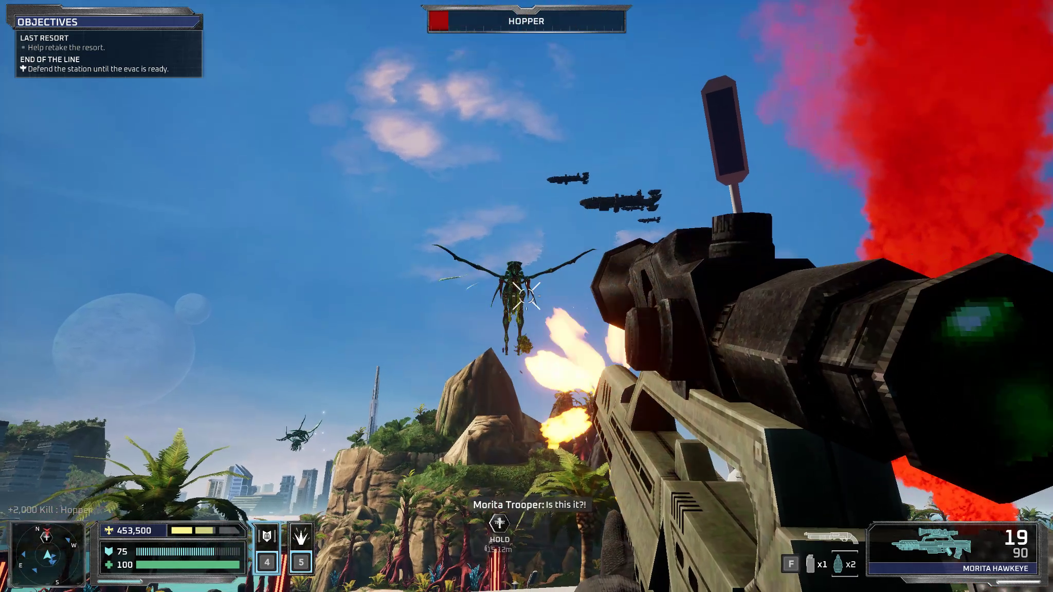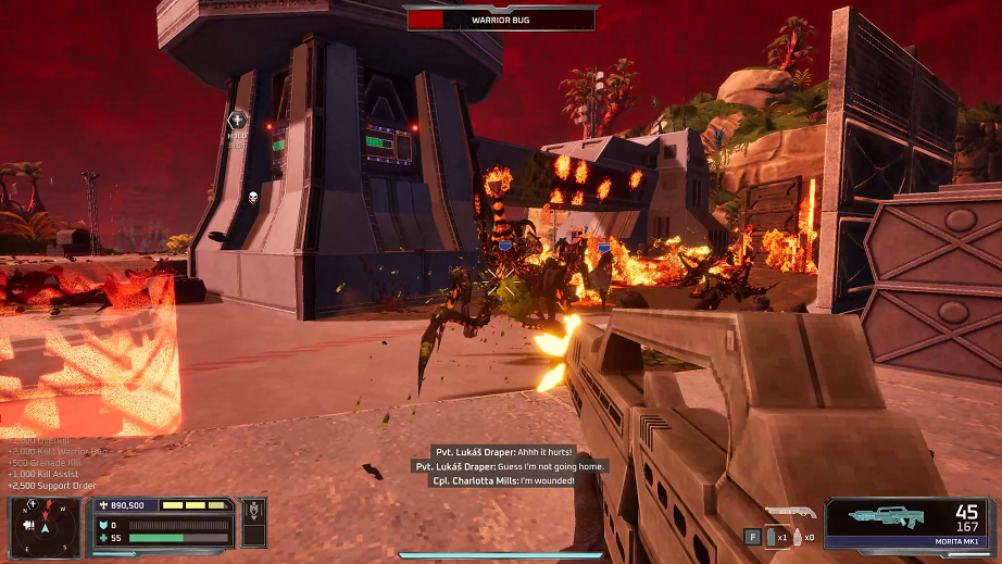 La campagne du jeu est constituée de 8 missions, dont la première fait office de tutoriel. On y trouve différentes sessions d'entrainement visant à apprendre à se déplacer (courir, sauter, se baisser, activer des tyrolienne), à viser et tirer, à changer d'arme et à utiliser grenades et autres armes tactiques. Le gameplay de base est très réactif et plaisant. Le jeu intègre même un système de rechargement dynamique inspiré de la série Gears Of War. Si on pouvait s'attendre à des niveaux linéaires, il n'en est rien. Chaque niveau de Starship Troopers Ultimate Bug War! est une grande zone ouverte avec un ou plusieurs objectifs indiqués à l'écran et leur position relative. A vous de voir dans quel ordre les effectuer, par quel chemin passer pour y accéder et parfois explorer un peu (cherchez les fumigènes rouges ou bleus ça aide) pour trouver un peu de ravitaillement en chemin, ou même des compagnons d'armes. Ces derniers, dirigés par l'IA (quel dommage qu'il n'y ai pas de mode coopération en ligne ou local), sont surtout de la chair à canon qui a surtout la fâcheuse tendance à se mettre devant votre ligne de mire. Il n'est pas rare qu'ils meurent de votre main plutôt qu'à cause des arachnides. Les objectifs sont assez variés, mais le plus courant sera de défendre une zone face à une horde d'ennemis. Ces scènes largement inspirées par le film sont bien retranscrites et - si vous avez fait le choix de ne pas jouer en facile - vous feront transpirer et recommencer de nombreuses fois. Heureusement, le jeu permet de sauvegarder à volonté quand vous voulez et sur différents slots. Cela ne sera pas de trop, car le jeu est loin d'être facile et est affublé d'énormes pics de difficulté. La scène du stade par exemple est un véritable enfer. Je n'ai même pas essayé les difficultés supérieures, je n'ose même pas imaginer l'horreur. Heureusement qu'il est parfois possible de "cheeser" le jeu et profitant de certaines lacunes d'IA, c'est sale mais ça sauve la mise. Et puis bon : à la guerre comme à la guerre. Si vous pensez que vous allez craquer, ou si vous vous retrouvez dans une situation inextricable, il est possible à tout moment dans les options d'activer des cheats modes permettant d'avoir des munitions illimitées ou un god mode d'invincibilité. A vous de voir. Sinon, jouez en facile c'est bien plus accessible (presque trop).