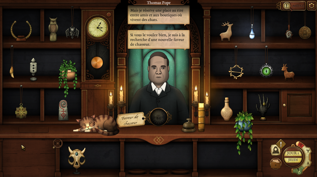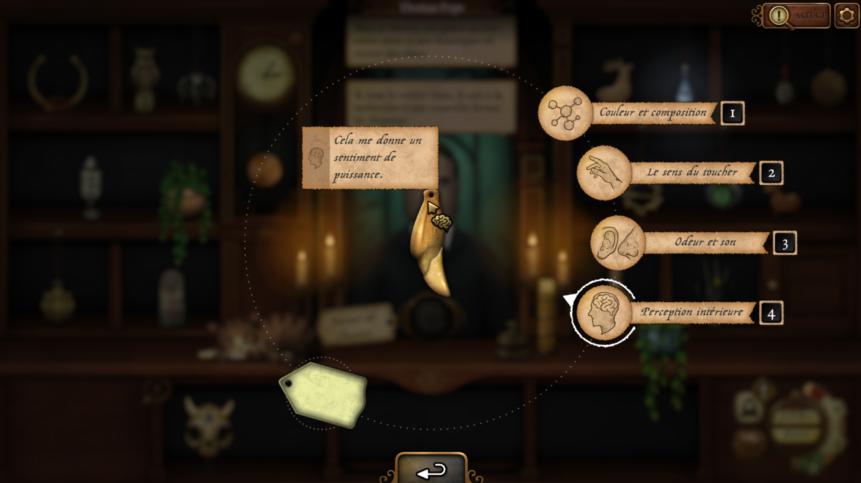 Par exemple, le tout premier client demandera une “faveur de chasseur”. En consultant le livre, on découvre que c’est un objet primitif conférant le pouvoir du prédateur, fabriqué à partir de trophées de bêtes tuées et assez brut dans sa conception. Dans la boutique, plusieurs objets pourraient correspondre, mais l’inspection détaillée d’une griffe en os à l’aide des quatre catégories (Couleur et composition, Sens du toucher, Odeur et son, Perception intérieure) révèle un sentiment de puissance, confirmant qu’il s’agit du bon objet.