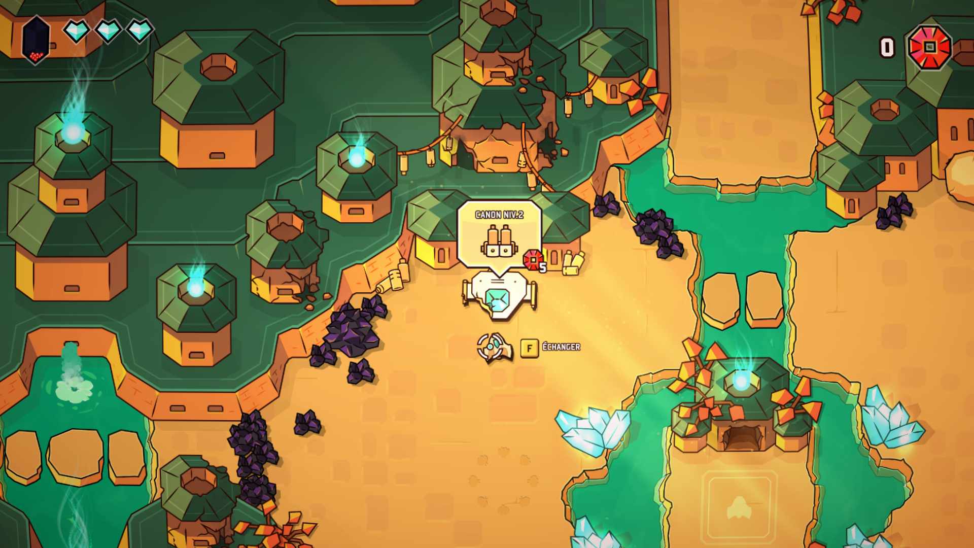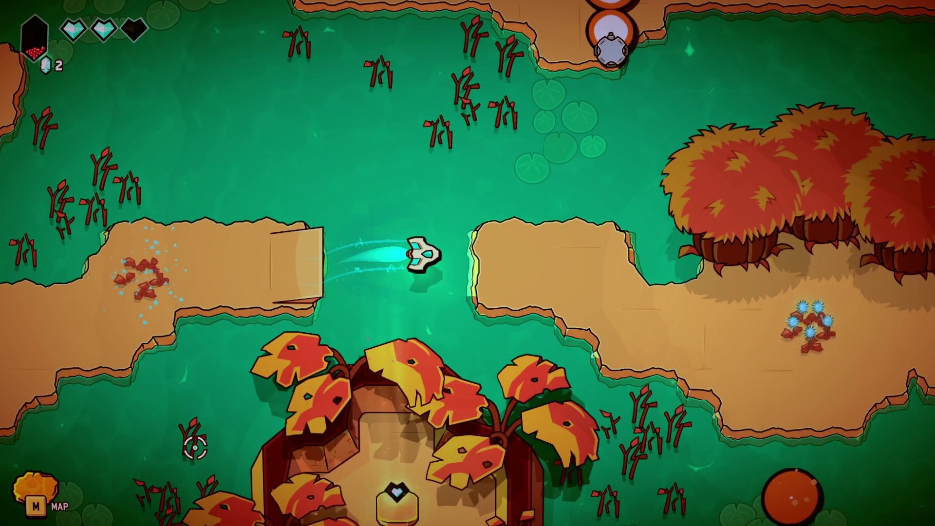 Evacuons tout de suite l'histoire de Minishoot' Adventures. Le désélu est revenu avec sa horde de sbires, s'en est pris à votre village et capturé vos amis dans du cristal corrompu. Vous êtes le nouvel élu du cristal et partez donc bille en tête sauver le monde. Voilà qui semble être assez classique avant d'apprendre qu'on incarne un vaisseau issu d'un peuple de vaisseaux. La narration existe dans Minishoot' Adventures, le jeu comprend même de jolies scénettes d'illustration. Le jeu est même entièrement traduit en plusieurs langues dont le français. Mais on ne va pas se mentir, là n'est pas l'intérêt du jeu, et le studio en est parfaitement conscient. Tout cela n'est qu'un prétexte pour proposer un jeu mêlant exploration, énigmes (pas trop non plus), adresse, action et surtout plein de petites boulettes. Le jeu se veut relativement ouvert avec une assez grande carte sur laquelle on se déplace librement. Mais à l'instar de Zelda, la carte est truffée de grottes qui donnent accès à un réseau souterrain de plus petites zones et même des donjons en écrans fixes. Pour se balader, le stick gauche fait le boulot, tandis que le droit sert à tirer dans la direction indiquée. Petit à petit, l'exploration permet de progresser en actionnant des mécanismes ou en trouvant des améliorations augmentant le panel de possibilités et surtout l'accès à de nouvelles zones en mode metroidvania. A titre d'exemple, le premier upgrade est un boost qui permet d'augmenter la vitesse de déplacement et de se servir de tremplins pour sauter de larges fossés. Selon la difficulté choisie (nous avons joué en normal) et les améliorations achetées, l'aventure devrait vous tenir dix bonnes heures. Si vous souhaitez prolonger l'expérience, il est conseillé de retarder au maximum l'achat de l'option qui affiche tous les lieux renfermant des objets à collecter car il facilite un poil trop les choses.