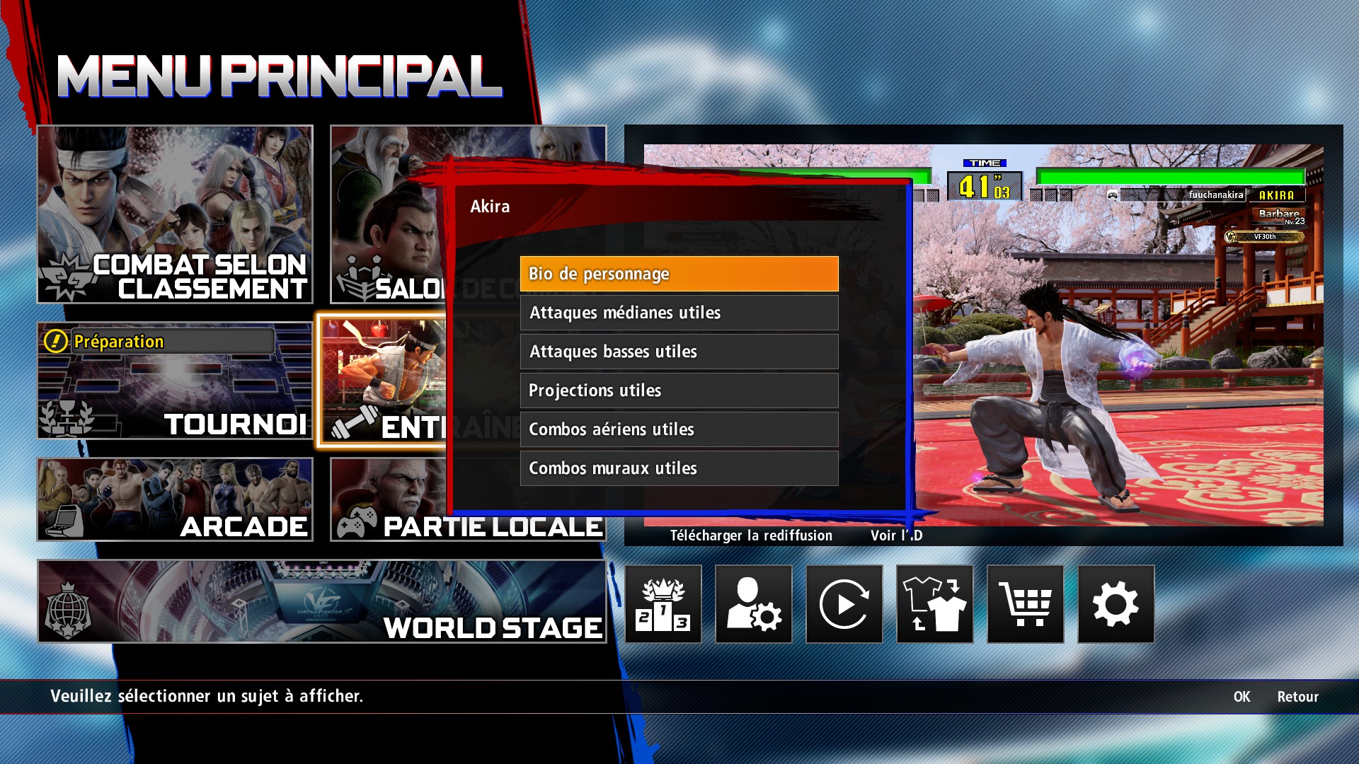 Virtua Fighter 5 REVO World Stage se distingue largement du Virtua Fighter 5 inclus dans certains jeux de la série Like A Dragon grâce à sa pléthore de modes de jeux (et de son moteur graphique adapté aux consoles modernes). Comme vous pourrez le voir sur la capture ci-dessus, le menu principal propose en premier lieu différents modes en ligne qui sont clairement le focus de cet épisode : Combat selon classement ou salon de combat (parties diverses non classées) sont accessibles à volonté tandis que le mode tournoi permet de participer à des tournois officiels disponibles à des dates prédéfinies. Les options en lignes sont assez nombreuses et il y a de quoi faire pour les amateurs. A noter que le jeu est en crossplay de base, on peut désactiver pour ne jouer qu'entre utilisateurs de la même machine. On le rappelle encore une fois, n'hésitez pas à passer par le mode entrainement avant tout car non seulement il est très complet, mais aussi parce que c'est votre seule chance de voir l'ombre d'une victoire en ligne. Pour les joueurs n'ayant pas envie de se prendre raclée sur raclée, direction le mode arcade et sa succession de 7 combats (8 si on compte le combat bonus contre Dural). Ici, la difficulté est largement paramétrable, ce qui permet aux débutants de se faire la main en douceur. Le mode partie locale permet tout simplement de se mesurer à un véritable ami en lui prêtant une manette. On reviendra ensuite sur le mode World Stage qui est le gros morceau de cette édition. Sur le côté droit du menu, on distingue quelques icones permettant d'accéder aux paramètres généraux et aux paramètres de parties en ligne (profil, personnage joué...), de revoir des matchs (avec possibilité d'image par image, retour en arrière et plus intéressant : de prendre la main à n'importe quel moment pour changer le cours des choses. On y trouve également un accès à la boutique en ligne du support pour pouvoir acheter l'un des DLC disponibles ainsi que l'écran de customisation des personnages qui sert à modifier les différents costumes disponibles en ajoutant des accessoires débloqués.