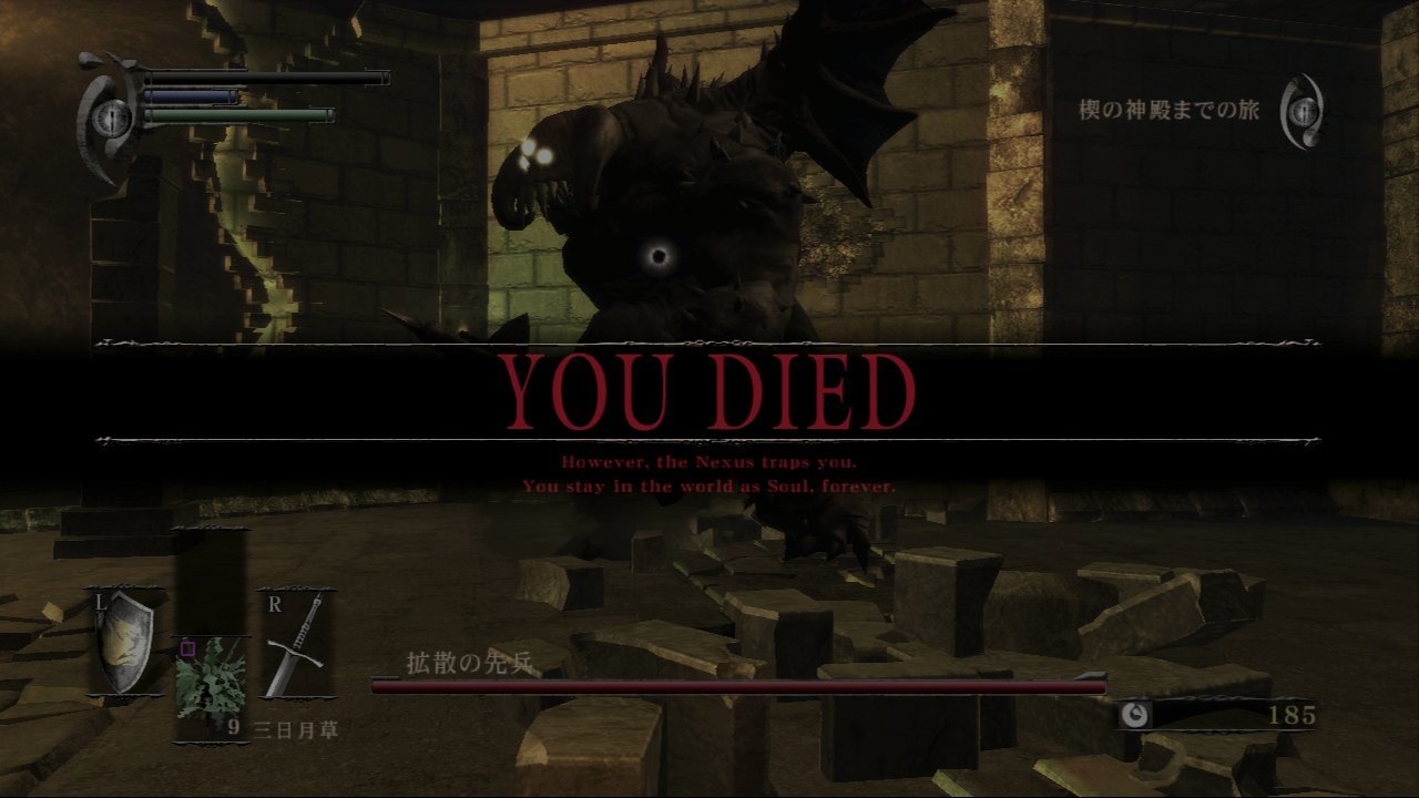 Premièrement, rushé n'est pas une option viable. On court, on meurt. On veut tuer rapidement, on meurt. On veut esquiver un mec, on tombe dans le vide, on meurt. C'est la base de Demon's Souls et il ne faut même pas une heure pour la comprendre. Il faut avancer à petit pas pour ne pas se faire surprendre par un crevard caché derrière un mur. Chaque ennemi ayant des paterns bien fichus et visibles, en prenant son temps on peut avancer sans prendre de dégâts. Tout ce qui compte c'est la patience et le résultat est vite gratifiant. Alors je suis déjà mort quelque chose comme trois ou quatre fois en deux heures. Et à chaque fois j'ai appris de mon erreur et j'ai passé l'obstacle le coup d'après. On a vraiment l'impression de vivre une des ses histoires de chevalier dans un château blindé de pièges, limite comme dans les livres dont on est le héros. On meurt, case dépard. C'est violent, mais croyez le ou non, j'ai trouvé ça super addictif, moi qui pourtant ne raffole pas de challenge surpuissant.