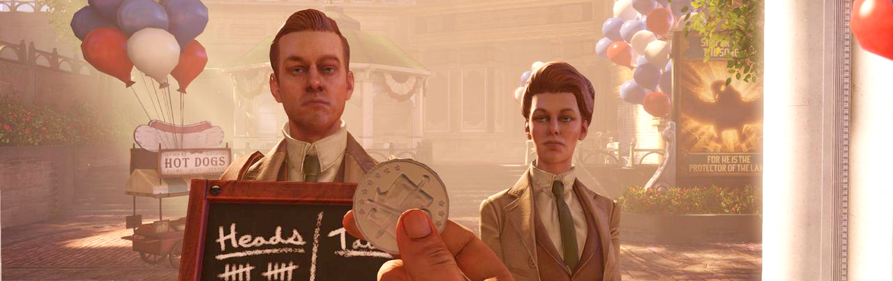 En effet, la première rencontre avec les Lutèce se fait au moment d'arriver vers la tombola. On vient de prendre possession d'une machine (et d'utiliser son premier pouvoir au passage) et voilà que se tiennent devant nous deux personnages. L'un porte un tableau noir tel un homme-sandwich et l'autre une petite assiette avec une pièce. Ils demandent à Booker de choisir pile ou face. Et là, si vous n'avez pas recommencé le jeu comme j'ai du le faire (à cause d'une sauvegarde malencontreusement écrasée) vous ne saurez pas que Booker peut répondre pile comme face. C'est la base de la véritable intrigue de Infinite. Cachée sous une énigme plus simple et plus à taille humaine (qui est Elizabeth ?) il y a en fait toute une réflexion sur les choix multiples et les réalités parallèles. L'idée du jeu est de dire, qu'à partir du moment où l'on fait un choix, où l'on subit une action, il existera un monde parallèle avec les mêmes choix passés mais aussi avec une déviation au choix que l'on vient de faire. Il y a donc une infinité d'univers parallèles puisque cette règle s'applique à tous les moments de la vie. Vous noterez au passage pourquoi Bioshock 3 s'appelle INFINITE.