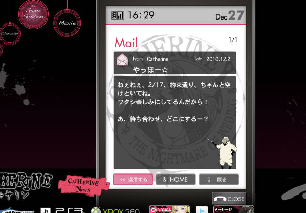Vous pensiez que c'était fini? Non, pas du tout! Le site officiel de Catherine a été mis à jour, et une surprise nous attend lorsque l'on clique sur le téléphone portable: on a recu un sms! Un sms de Catherine en plus!