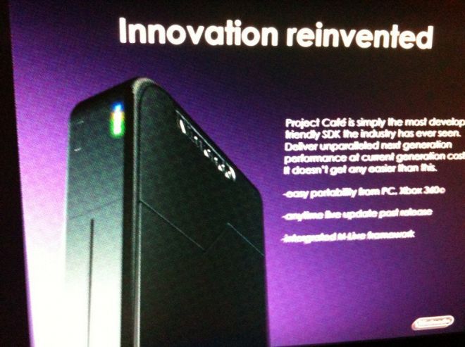Se pourrait il qu'une image du project Café ait été prise et diffusée sur le net? Dur à dire, mais il y a souvent des fuites. En tout cas, le site Gamertagradio pense avoir mis la main sur une image, montrée lors de ce qui pourrait être une conférence, de la prochaine machine de Nintendo. Bien sur, il pourrait s'agir d'une fausse image... Mais dans le doute, j'avais quand même envie de vous la montrer.