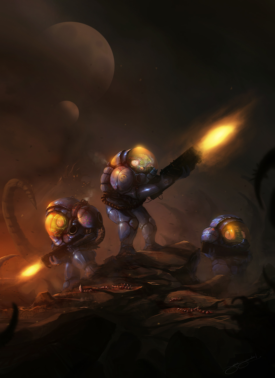Ca faisait longtemps que je n'avais pas fait un article sur une oeuvre ayant un rapport avec les jeux vidéo. Cette fois, il s'agit d'un dessin mélangeant les univers de World of Warcraft et de Starcraft. Je ne suis pas spécialement fan des deux, pour être honnête. Mais il y a une créature que j'ai souvent rencontré dans WoW, quand j'explorais le monde, et plus particulièrement quand je m'approchais des plans d'eau... ce sont les (très énervants/collants) Murlocs! Ces espèces d'hommes-poisson qui gueulent en se jetant sur vous, pour vous empaller avec leurs petites lances pointues. Ils ne sont pas très forts, mais ils sont souvent nombreux... bref, je ne sais pas pourquoi, mais je les aime bien. Un peu comme quand on aime bien les squelettes... Quoi, vous n'aimez pas les squelettes? Bon, en tout cas, ces Murlocs en armures de Space Marines sont bien classes je trouve. On doit cette oeuvre à Blinck, dont je vous invite à voir la gallerie DeviantArt, pour apprécier son style vraiment magnifique.