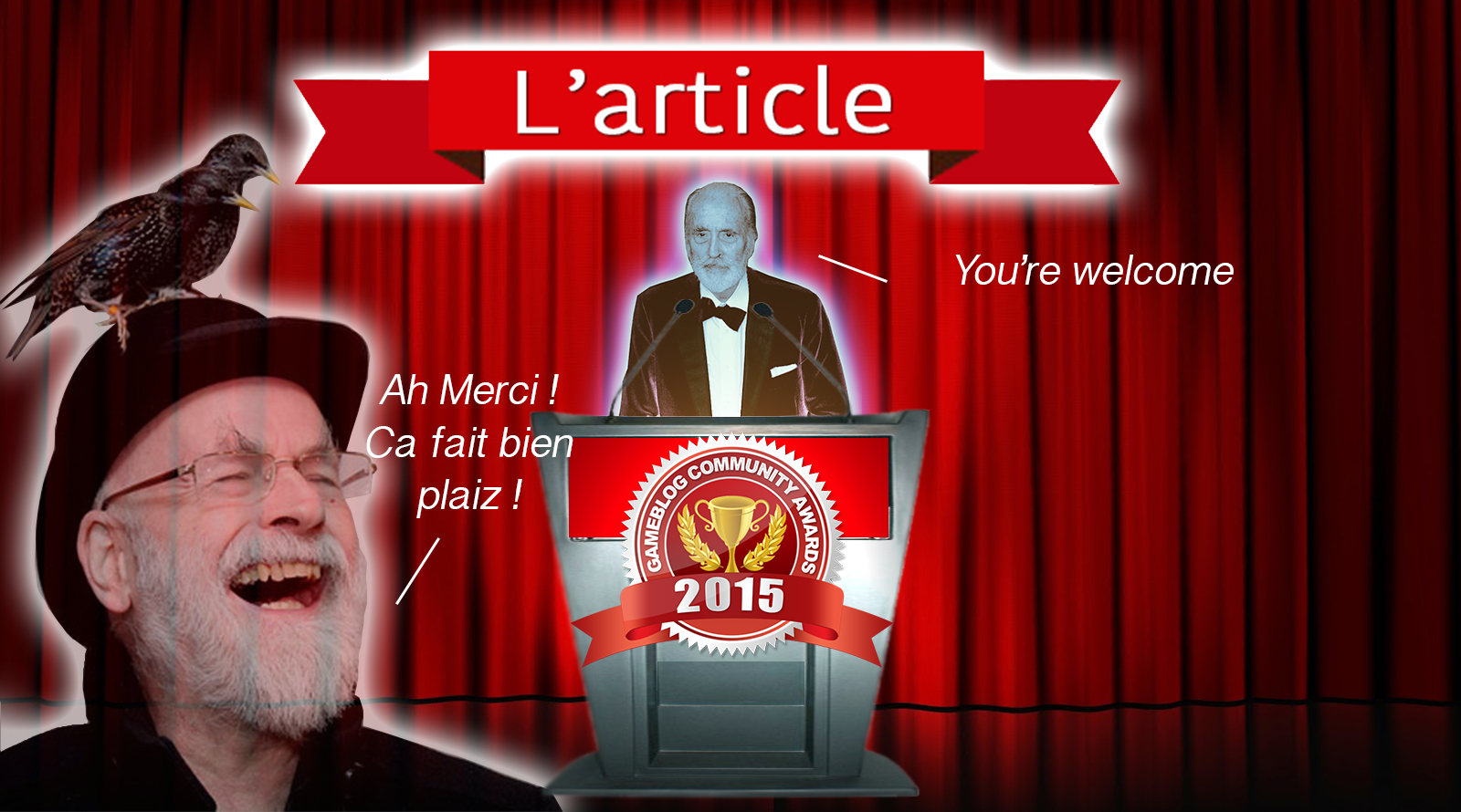 Yeah, et nous continuons cette incroyable cérémonie avec les 3 dernières catégories, en commençant par le prix qui récompense le meilleur article de 2015, qu'il soit issu des blogs, des articles ou des tests. Et pour remettre ce prix, j'accueille l'immense fantôme de Christopher Lee.