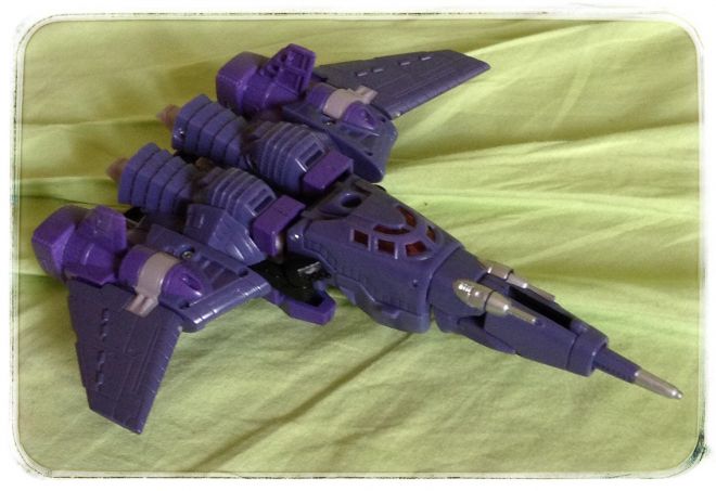 Un transformers "Cyclonus" recent a priori (le modele daterait de 2011) mais qui n'est pas issu des films. Je sais pas trop de quelle série il est tiré. Si son design robot est tres classique (il a de belles oreilles de lapin sur la tete) la transformation en jet futurise me fait penser aux design des vaisseaux dans les shmup de la pcengine, comme final soldier. Bonne pioche pour 1€ !