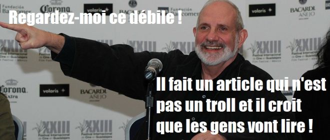 Mais si je suis en effet fasciné par ces trois oeuvres - en tant qu'oeuvre, sans même parler de quelque chose de plus large -, L'Impasse m'a avant tout permis de découvrir Brian de Palma, cinéaste absolument fascinant, capable de proposer le meilleur (Phantom of the Paradise, Carrie, Blow Out, Scarface, Mission : Impossible) comme le pire (Pulsions, Femme Fatale, Le Dahlia Noir, et même Passion début 2013). De tous les réalisateurs du nouvel Hollywood, parmi lesquels on retrouve notamment Spielberg, Lucas et Scorsese, il est aujourd'hui le seul a avoir été banni d'Hollywood, avec, en partie, Francis Ford Coppolla, mais qui arrive tant bien que mal à s'accrocher grâce à son entreprise l'American Zoetrope (merci Jayetbobfr). Son dernier passage au festival de Cannes 2013 fut particulièrement triste, puisqu'il y est allé pour tenter de récolter des fonds pour son prochain film, Happy Valley, tandis que son collègue Spielberg, lui, était tout simplement président du jury. Triste, vous dis-je.