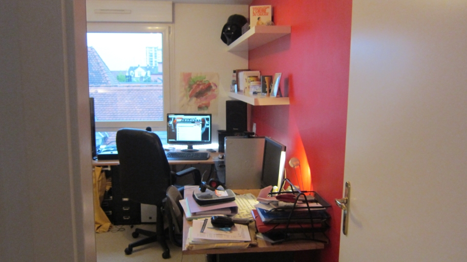 Pour commencer l'arrivée dans la pièce ,ou on tombe directement sur le bureau de madame. Je ne suis pas le seul à savoir manier un PC, mais elle ne s'en sert que pour travailler. Dans le fond on distingue mon bureau et sur la droite le mur rouge qui m'a donné tant de fil à retordre. Ce n'est pas vraiment la peinture qui a posé problème (4 couches tout de même), mais surtout les étagères qui sont fixés dans un mur porteur en béton armé. Lequel n'a pas hésité un seul instant à exploser par endroits sous les assauts de ma perçeuse à percussion. J'en ai donc été quitte pour faire de l'enduis avant de pouvoir peindre.