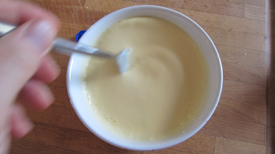 Dans un bol, mélanger le sucre les oeufs et la crème jusqu'à obtenir une mixture homogène.