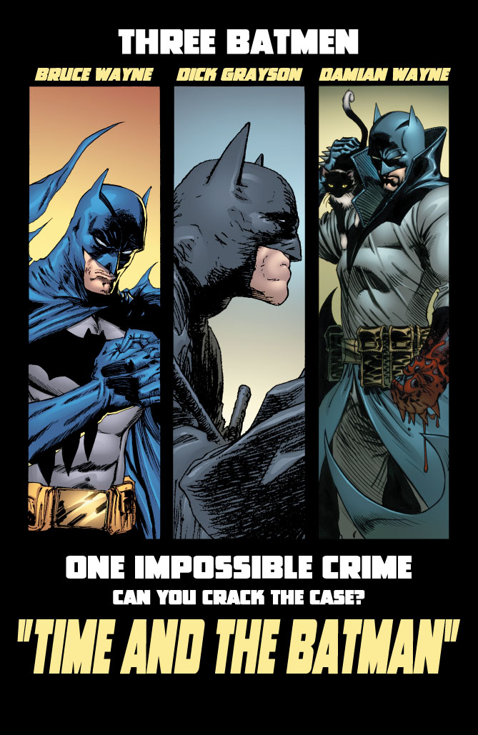 Trois époques, Trois Batmen. Bruce Wayne pour le passé, Dick Grayson pour le présent et Damian Wayne pour le futur. Tous unis sur une seule et même enquête. Commençant par Bruce Wayne et s'achevant pas son fils Damian.