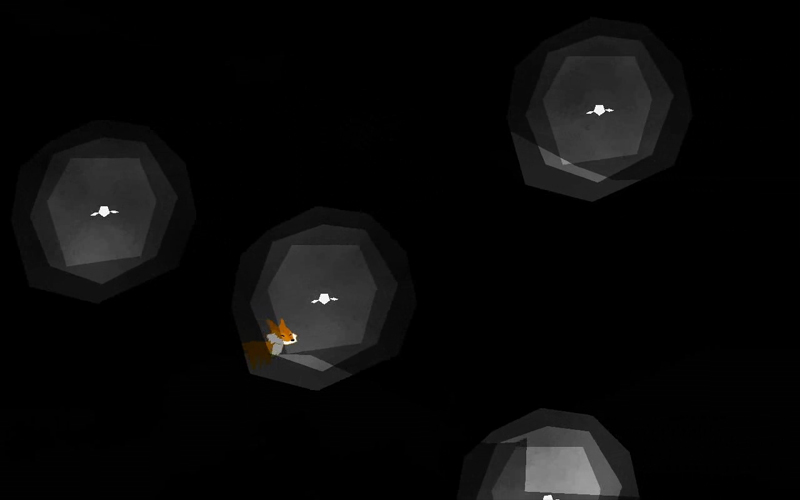 3 - "Le joueur peut se perdre dans le noir" : quand le renard n'est pas éclairé par une luciole, le joueur ne voit pas où se trouve son personnage ni ce qui l'entoure et peut donc se perdre facilement. Au lieu de l'obliger à suivre les lucioles, on donne au renard la possibilité de tenir dans sa gueule un objet qui éclaire tout autour de lui, ce qui facilite grandement la navigation au sein du niveau et la reconstitution mentale du labyrinthe.